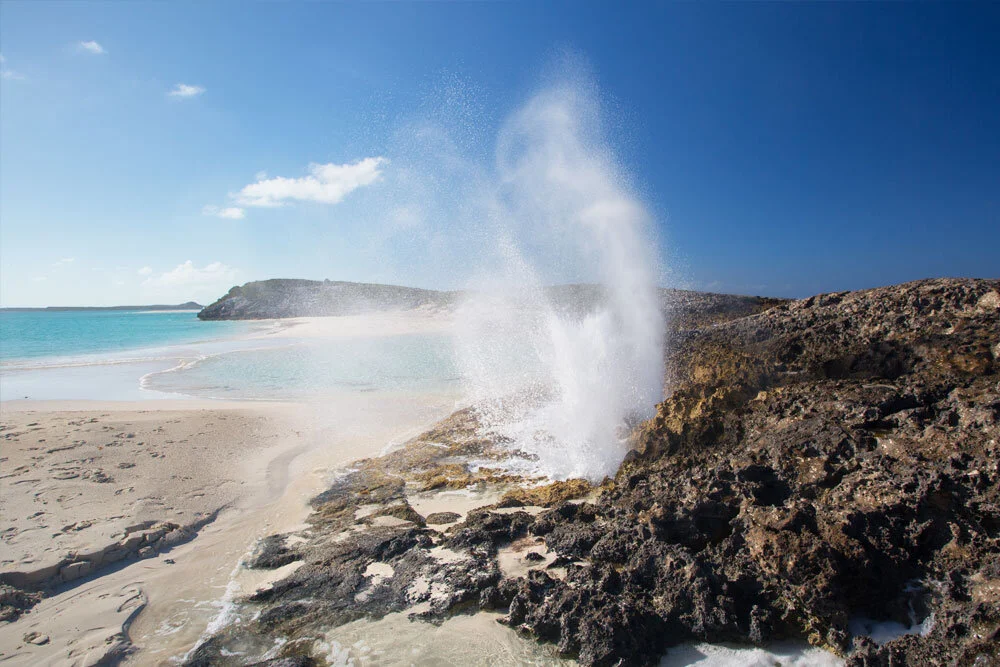 Blowhole Cay/Beach is an island north of Great Exuma that is known for spectacular geysers of water that seemingly explode out of the beaches and rocks. While on your way to other attractions such as the pigs, you can stop here on the sandy beach area to observe and take some spectacular photos!
